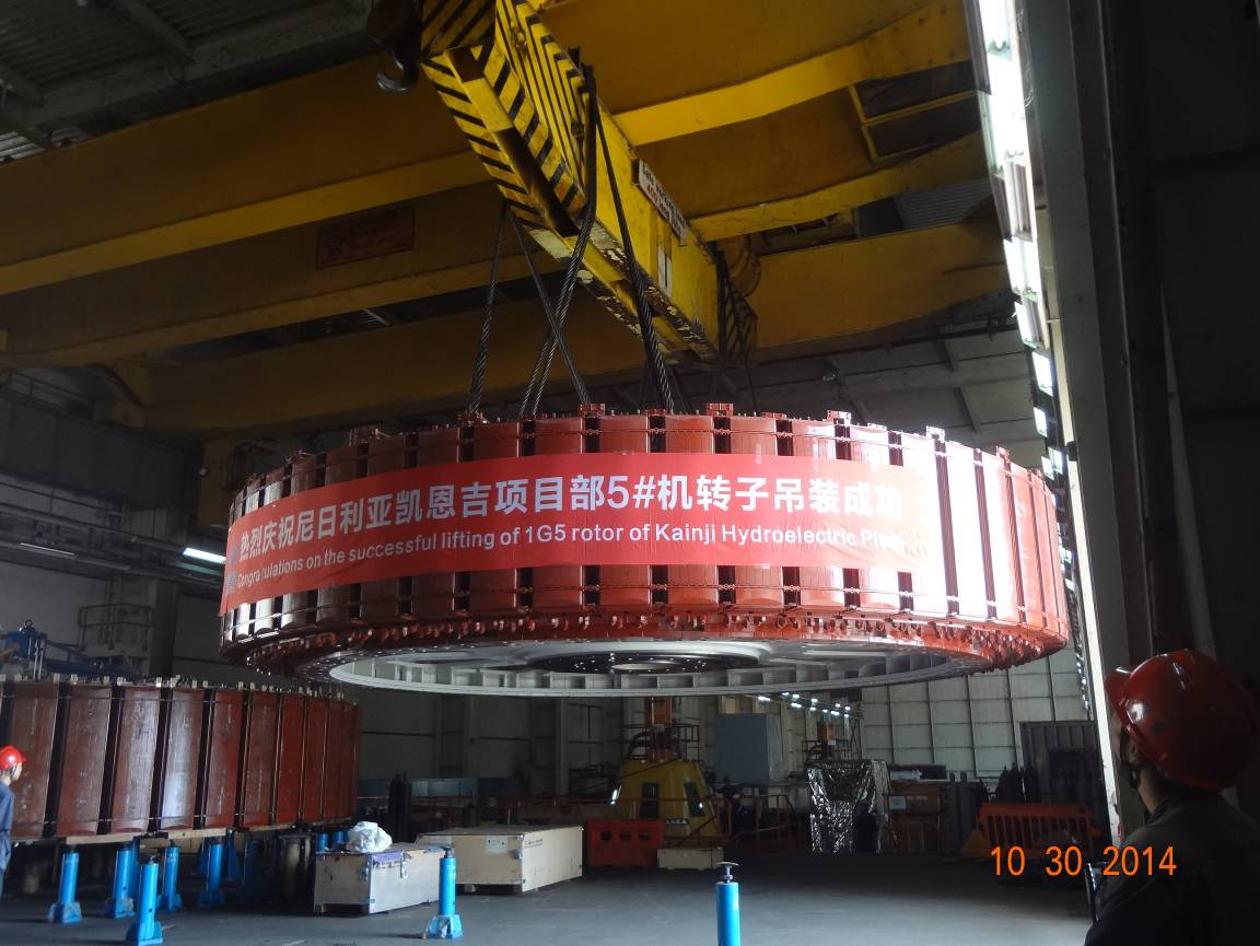 1G5 发电机转子的成功吊装,标志着凯恩吉电站机组安装一个重要节点完成,为该机组今年年底具备发电条件奠定了坚实的基础。