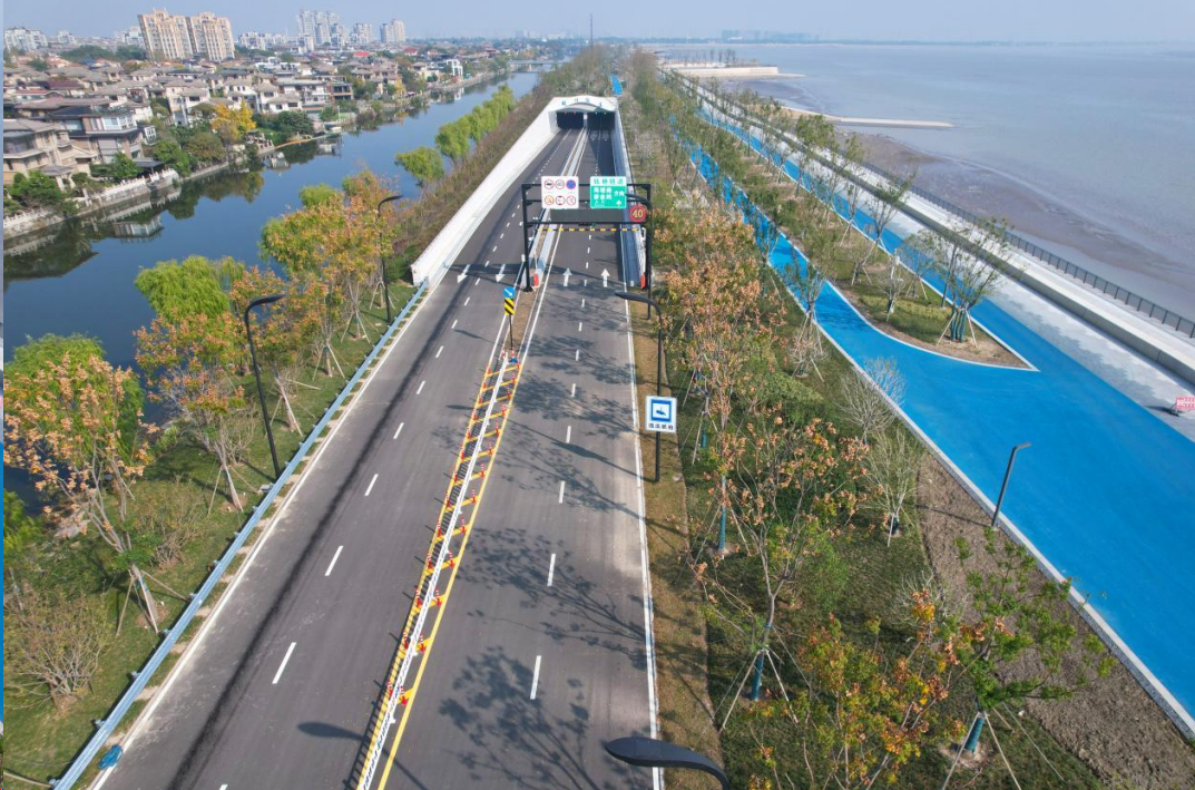 项目建设突破传统海塘“以高御潮”的思路,采用“以宽度换高度”设计理念,通过融合建设,使海塘防御潮水的有效结构宽度达45米,大幅提升结构稳定性,将海堤的御潮标准提升至300年一遇,护佑江河安澜。同时,将海塘加固建设与沿线要素紧密结合,各段海塘风貌迥异、功能多元:东部河口田园段强调生态修复与田园风貌,中部千年古塘胜迹段突出文化遗产保护与展示,西部滨海都市段则注重市政配套与城市景观融合,建设高品质的综合性海塘。